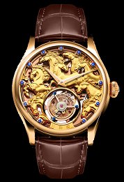 Design of Zodiac Series - Dragon Tourbillon was inspired by ancient wood carving ornament in the Qing Dynasty called “The fish of dragon”. was inspired by ancient wood carving ornament in the Qing Dynasty called “The fish of dragon”. The stunning face of the Dragon tourbillon is highlighted by the carving of the story of “The fish of dragon”; The tourbillon at 6 o’clock position resembles a pearl, rotates rhythmically under the dragon talons. The dial elegantly surrounds with rose gold plated Chinese style border, embedded with 12 diamonds as the index. ”.